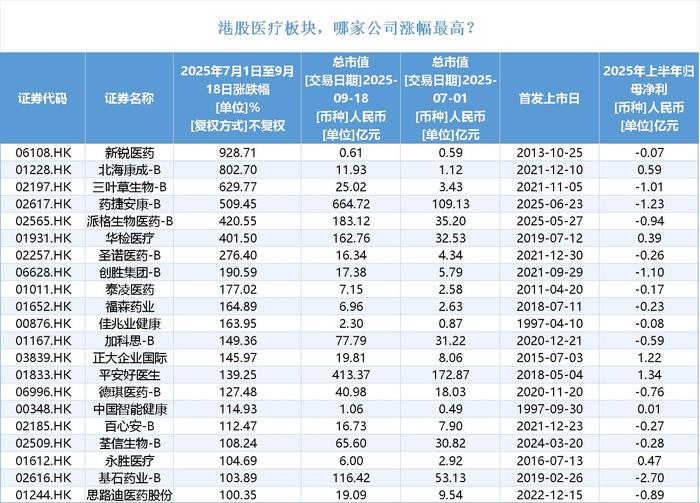 据界面新闻统计,7月1日至9月18日,不到三个月时间里,港股264家医药上市公司中,201只股票实现上涨,69家涨幅超50%,21家涨幅突破100%。与此同时,这些市值暴涨的上市公司,多数业绩成亏损状态。