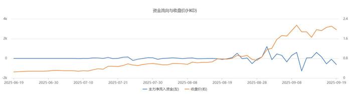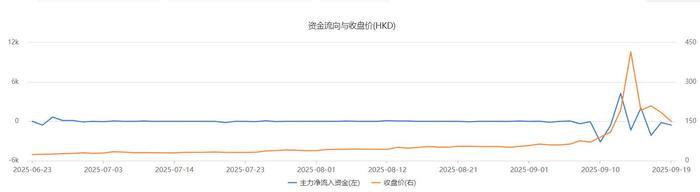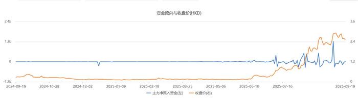 该股于2021年上市,在今年7月以前几乎无资金关注。自7月11日起,主力资金开始活跃,单个交易日买入金额少则二三十万港元,多则一两百万港元。进入9月,有6个交易日主力资金单日买入金额超过1000万港元。其股价从7月1日的0.29港元/股一路涨至9月18日的2.11港元/股,市值从3.76亿港元涨至27.37亿港元。